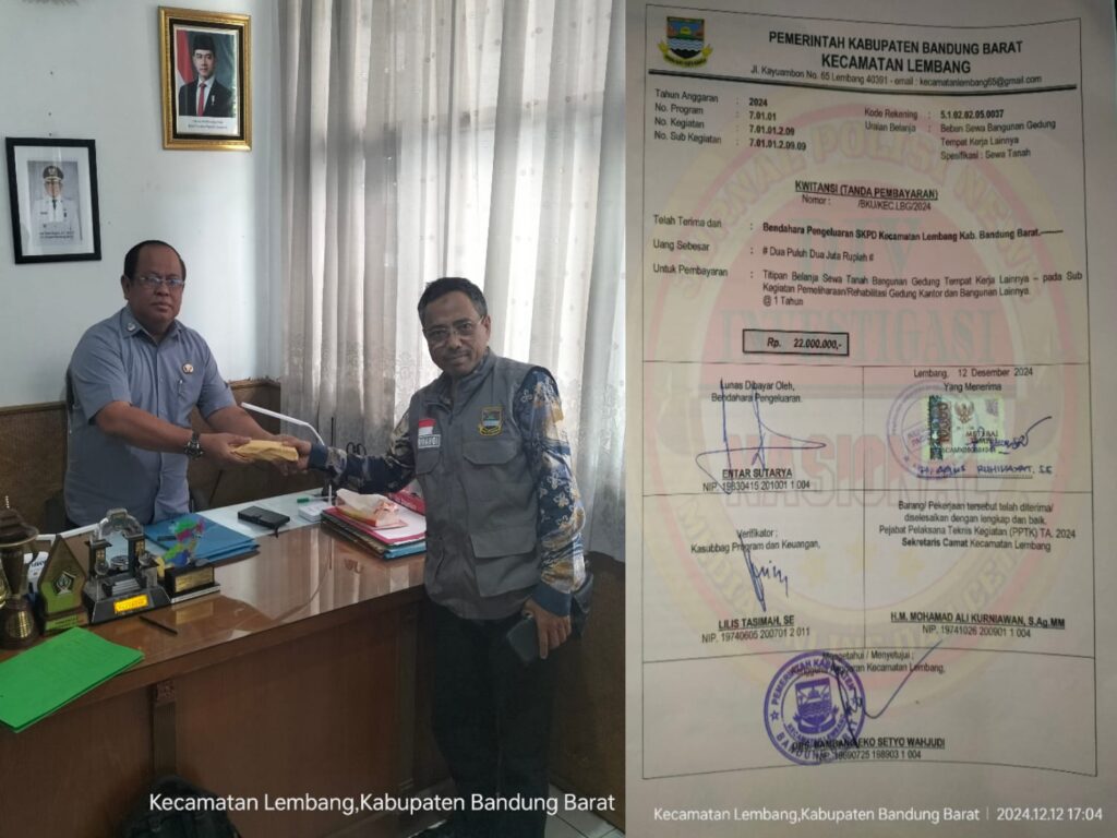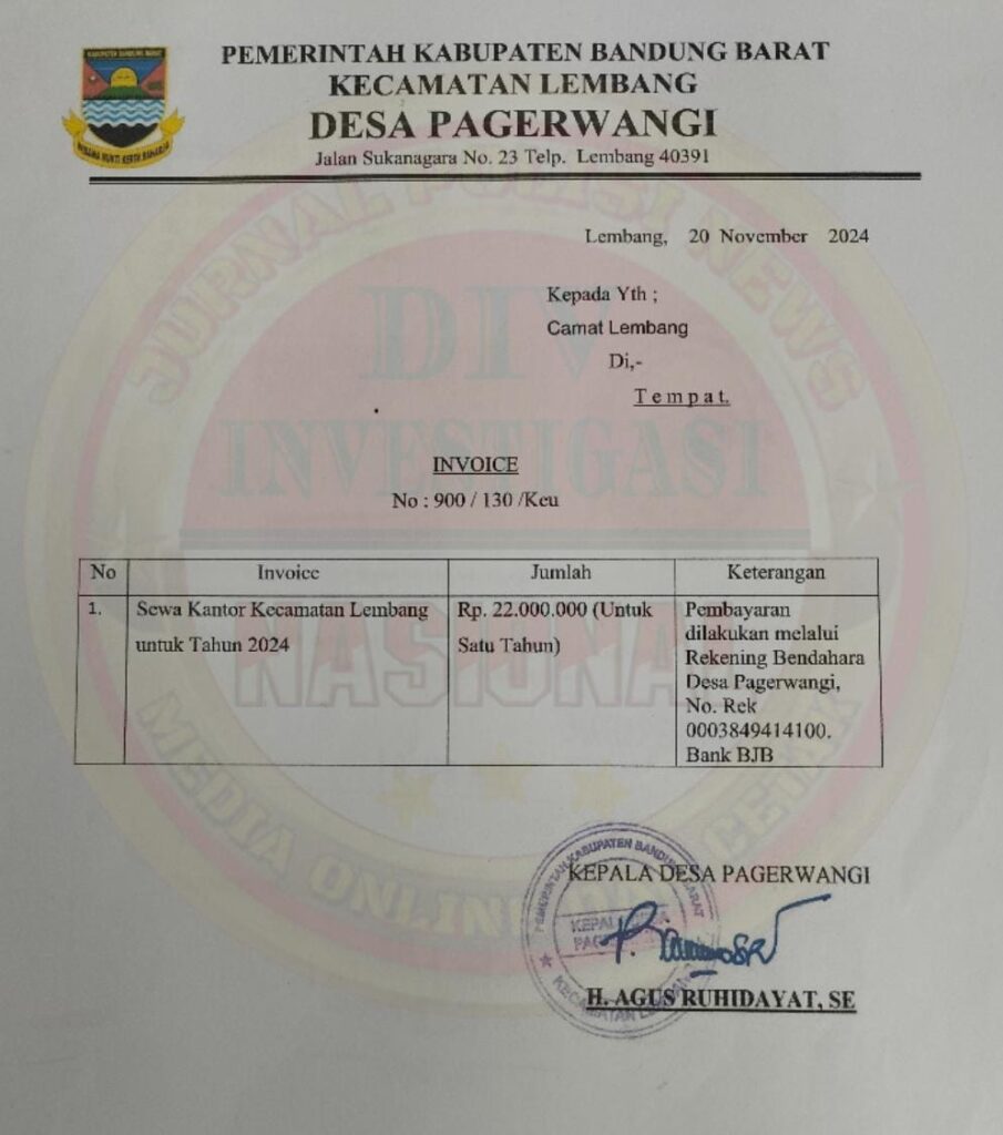 Diketahui, sebelumnya Pemerintah Desa Pagerwangi mengirimkan invoice kepada Camat Lembang terkait penagihan sewa Kantor Kecamatan Lembang untuk satu tahun (2024) sebesar Rp22 juta tertanggal 20 November 2024.