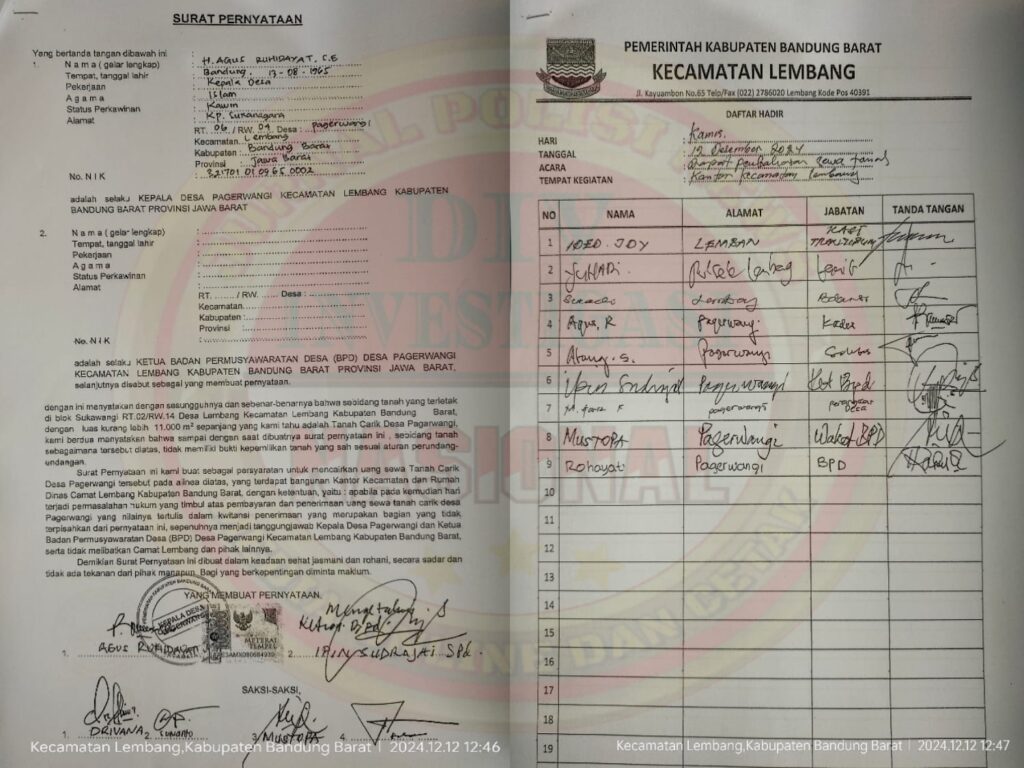 Berdasarkan pantauan Tim Investigasi Jurnal Polisi News, inti dari pertemuan itu, Pemerintah Kecamatan Lembang sudah menyiapkan anggaran untuk pembayaran sewa tanah sebesar Rp22 juta, dengan catatan Kepala Desa Pagerwangi Agus Ruhidayat beserta Ketua BPD Desa Pagerwangi Jemy bersedia menandatangani surat pernyataan pertanggungjawaban pembayaran sewa tanah yang telah disiapkan oleh Pemerintah Kecamatan Lembang untuk mengantisipasi kemungkinan terjadinya salah bayar yang berpotensi menimbulkan kerugian negara.