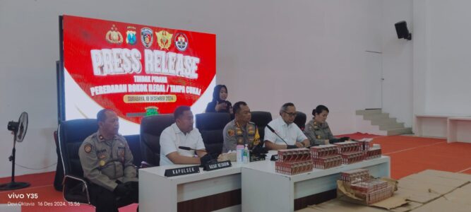 16 Desember 2024 – Tim gabungan dari Polsek Simokerto, dan Satreskrim Polrestabes Surabaya, dan Bea Cukai Kanwil I berhasil menggagalkan pengiriman rokok ilegal tanpa pita cukai merek SS yang rencananya akan diedarkan di wilayah Banyuwangi.