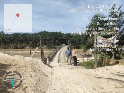 Jembatan gantung ini diketahui sebagai akses jalan penghubung antara Desa Bumi Mulya, Kecamatan Logas Tanah Darat, dan Dusun SP2 Desa Sumber Jaya, Kecamatan Singingi Hilir. Perbaikan tiang jembatan dilakukan secara swadaya oleh seorang warga, Sdr. S, yang menggunakan alat berat untuk mendukung pekerjaan tersebut.