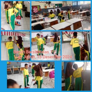 Lanjut Ibu Rini Guru kelas 1E Setiap pagi sebelum memulai pelajaran, para siswa bersama-sama membersihkan kelas mereka. Tugas dibagi secara adil, seperti menyapu, mengepel, membersihkan papan tulis, dan merapikan meja serta kursi. Guru kelas memberikan arahan dan memastikan setiap siswa menjalankan tugasnya dengan baik.