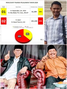 Hal ini terbukti, paslon H Zukri-Husni Tamrin unggul telak dengan perolehan suara melalui quick count koalisi pada hari Rabu tanggal 27 November 2024.