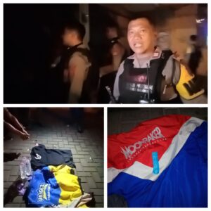 Saat pemeriksaan, petugas menemukan sejumlah barang bukti, di antaranya sebilah senjata tajam jenis badik dan pisau kecil, serta obat-obatan golongan G dan 4 botol miras jenis leci yang disembunyikan dalam jaket oknum-oknum tersebut.