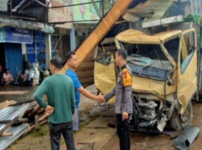 “Truk melaju dari arah Pontianak menuju Tayan Hilir dan diduga mengalami rem blong. Akibatnya, truk tersebut menabrak dua ruko,” ungkap AKP Risqi.
