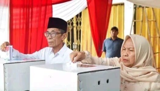 Wakil Bupati Batanghari H. Bakhtiar dan Istri memberikan hak pilih dalam Pemilihan Umum kepala Daerah (Pemilukada) untuk tingkat Provinsi Jambi dan tingkat Kabupaten Batanghari di TPS.004 Kelurahan Teratai Kecamatan Muara Bulian. Rabu, 27/11/2024.