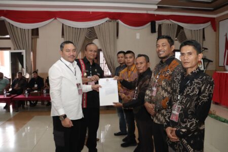 Ketua KPUD Pakpak Bharat, Basra Munthe membacakan Surat Keputusan KPU RI tentang pemenang Pemilihan Bupati dan Wakil Bupati Pakpak Bharat pada Pilkada Serentak 2024, yakni pasangan calon nomor urut I (Franc Bernhard Tumanggor/H Mutsyuhito Solin, Dr, M.Pd).