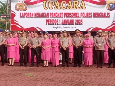 Kapolres Bengkalis memimpin langsung upacara kenaikan pangkat sejumlah personel Polres Minahasa dalam sebuah acara yang berlangsung khidmat dan penuh nuansa kekeluargaan, Rabu (tanggal 1 Januari 2025) Upacara ini dihadiri oleh pejabat utama Polres keluarga para personel yang naik pangkat, serta seluruh jajaran anggota kepolisian setempat 01-01-2025.