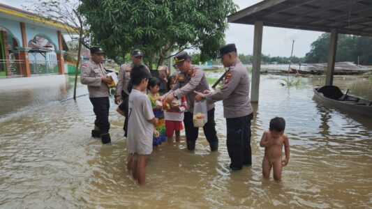 Hibur anak-anak yang terdampak banjir, Kapolsek Kampar Kiri Hilir, IPTU Irwan Fikri sambangi warga yang terdampak banjir di desa Mentulik kecamatan Kampar Kiri Hilir, Kamis, (16/1/25).
