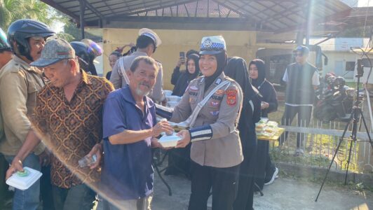 Seorang pengemudi becak motor yang menerima nasi kotak tampak terharu. “Rezeki memang datang dari arah yang tidak terduga. Terima kasih, Pak Polisi,” ucapnya lirih, sambil menggenggam kotak nasi itu erat.