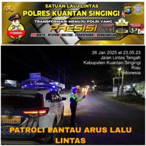 Guna memastikan keamanan, keselamatan, ketertiban, dan kelancaran lalu lintas (Kamseltibcarlantas) selama libur Isra’ Mi’raj dan Tahun Baru Imlek 2025, Sat Lantas Polres Kuansing melaksanakan patroli malam pada Minggu, (26/1/2025). Kegiatan ini dimulai pukul 23.00 WIB hingga selesai, dengan sasaran utama daerah rawan kecelakaan lalu lintas (Lakalantas) di wilayah Kabupaten Kuantan Singingi. Patroli ini dilakukan sebagai langkah preventif untuk mengantisipasi tingginya volume kendaraan yang melintas di masa libur panjang, terutama di ruas-ruas jalan yang sering menjadi titik rawan kecelakaan.