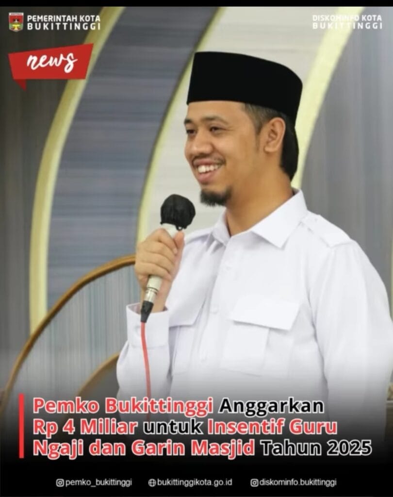 Sebanyak Rp.4.069.100.000, Pemko Bukittinggi alokasikan anggaran untuk bantuan insentif bagi guru ngaji dan garin masjid pada tahun 2025.