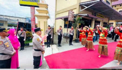 Setibanya di gerbang Mapolres Kerinci, kedatangan AKBP Arya Tesa Brahmana disambut secara resmi dengan laporan kesatuan, tarian tradisional, dan tradisi Pedang Pora, yang menjadi simbol penghormatan.
