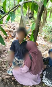 Tampak pria diduga tewas gantung diri di pohon coklat mengenakan kain basahan ini ditemukan di perkebunan warga Desa Ujung Gurap, Jumat ( 3/1/2025) kemarin sekitar pukul 08.45