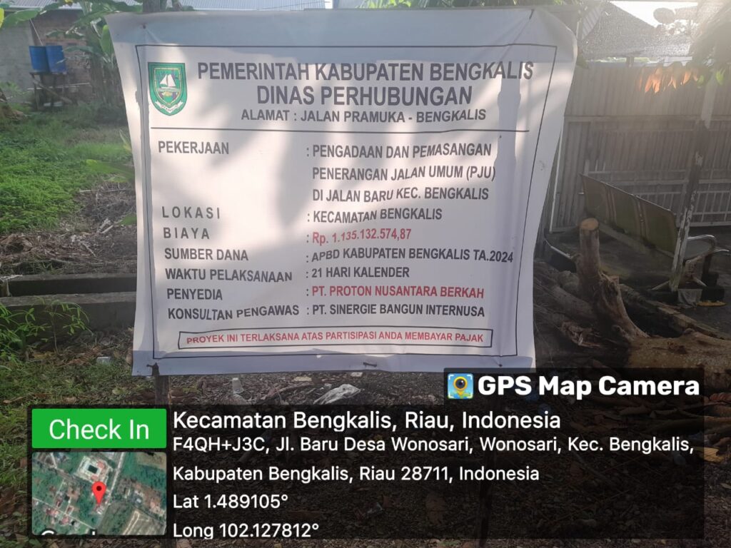 Proyek Dinas Perhubungan Kab Bengkalis telah menganggarkan pekerjaan angaran APBD TA 2024, Pengadaan dan pemasangan Penerangan Jalan Umum (PJU) Jalan baru Kec Bengkalis dengan anggaran pagu Rp 1.1 Milyar lebih, dilaksanakan PT PROTON NUSANTARA BERKAH, Konsultan pengawas PT SINERGIE BANGUN INTERNUSA sampai saat ini masih dikerjakan pihak rekanan kontraktor.