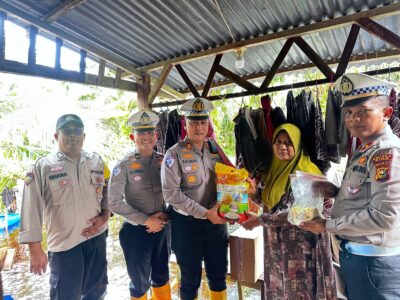 Untuk menanggulangi situasi ini, Kasat Lantas AKP Kaliman Siregar bersama stafnya menggunakan perahu untuk menyambangi rumah kedua keluarga tersebut. Dengan sigap, mereka memberikan bantuan sembako kepada warga yang terisolasi tersebut.