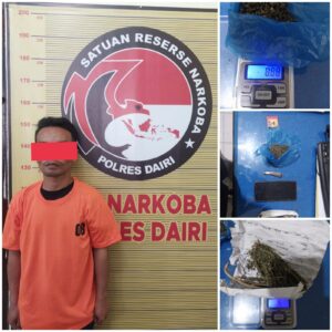 Polres Dairi meringkus seorang pria berinisial KM (29) atas kepemilikan narkotika jenis Ganja di rumahnya yang berada di Desa Pegagan Julu V Kecamatan Sumbul Kabupaten Dairi, Rabu (22/1/2025).