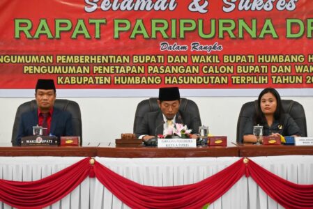 Ucapan selamat disampaikan kepada Dr.Oloan P. Nababan, SH.,MH dan Junita Rebeka, SH., M.A.P. sebagai pasangan Bupati dan Wakil Bupati Humbang Hasundutan terpilih masa jabatan 2025-2030, Pimpinan DPRD berharap dapat membangun kemitraan dalam mengemban tugas yang mulia ini dengan sebaik-baiknya, dan kiranya dapat melanjutkan estafet pembangunan yang barangkali belum terselesaikan oleh Bupati dan Wakil Bupati masa jabatan sebelumnya, semoga Tuhan senantiasa memberikan perlindungan dan hikmat bijaksana dalam mengemban tugas dan tanggungjawab ini. Menjadi harapan kami juga bahwa kedepan komunikasi politik yang mesra antara pemerintah daerah bersama lembaga DPRD dapat terjalin dengan baik dan harmonis dalam merangkai rencana pembangunan sehingga Humbang Hasundutan yang semakin baik dapat terwujud.