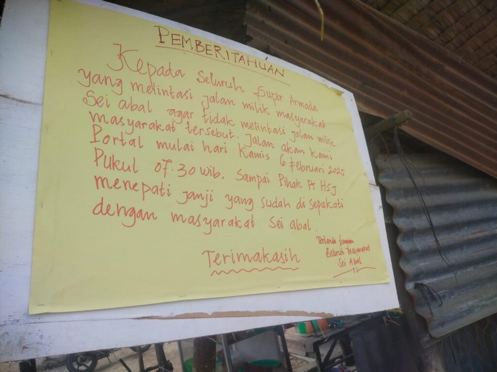 “Jalan Akan Kami Portal Mulai Kamis 6 Februari 2025, Pukul 07.30 WIB. Sampai Pihak PT HSJ Menepati Janji Yang Sudah Disepakati Dengan Masyarakat Sei Abal. Tertanda Tangan Seluruh Masyarakat Sei Abal. Terima Kasih.” Demi disampaikan masyarakat tersebut.