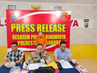 Kapolresta Pekanbaru KOMBES POL JEKI RAHMAT MUSTIKA, S.I.K., Melalui Kapolsek Binawidya Kompol Asep Rahmat,S.H,.S.I.K. MM didampingi Kanit Reskrim Polsek Binawidya melakukan konferensi pers tentang penangkapan pelaku Tindak Pidana Narkotika Jenis Sabu-Sabu di wilayah Hukum Polsek Binawidya Kota Pekanbaru. Rabu, (1l05/02/2025)