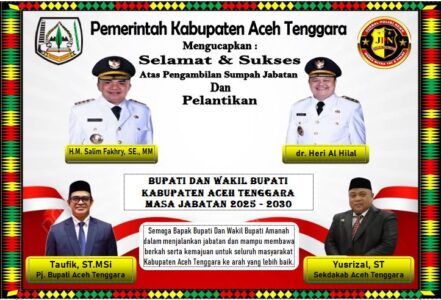 Pemerintah Kabupaten Aceh Tenggara Mengucapkan Selamat dan Sukses atas Pengambilan Sumpah Jabatan dan Pelantikan Bupati dan Wakil Bupati Aceh Tenggara 2025-2030, ” Semoga Bapak Bupati dan Wakil Bupati Amanah dalam menjalankan jabatan dan mampu membawa berkah serta kemajuan untuk seluruh masyarakat Kabupaten Aceh Tanggara ke arah yang lebih baik “