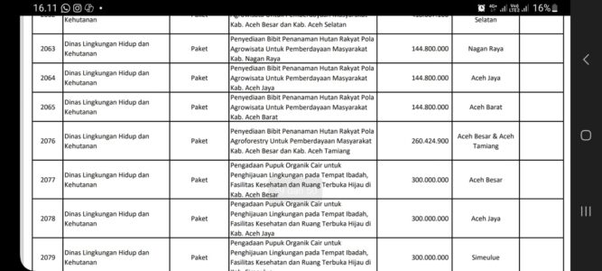 Seperti pengadaan pada Dinas Lingkungan Hidup dan Kehutanan Aceh. Terdapat program ‘pengadaan pupuk organik cair untuk penghijauan lingkungan pada tempat ibadah, fasilitas kesehatan, dan ruang terbuka hijau’ yang diplot sebesar Rp300 juta per kabupaten / kota.
