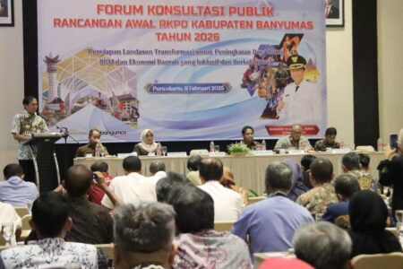 Pemerintah Kabupaten Banyumas menggelar Forum Konsultasi Publik Rancangan Awal Rencana Kerja Pemerintah Daerah RKPD Kabupaten Banyumas Tahun 2026. Kegiatan ini digelar di Hotel Surya Yudha Purwokerto Selasa 11 Febrruari 2025 dengan mengusung tema “Penyiapan Landasan Transformasi untuk Peningkatan Daya Saing SDM dan Ekonomi Daerah yang Inklusif dan Berkelanjutan”. Hadir dalam kegiatan Penjabat (Pj) Bupati Banyumas Iwanuddin Iskandar, Ketua DPRD Banyumas Subagyo, Wakil Bupati terpilih Dwi Asih Lintarti, Sekretaris Daerah (Sekda) Banyumas Agus Nur Hadie, serta tamu undangan lainnya. Sementara Bupati Banyumas Terpilih Sadewo Tri Lastiono hadir dan memberi sambutan secara virtual.