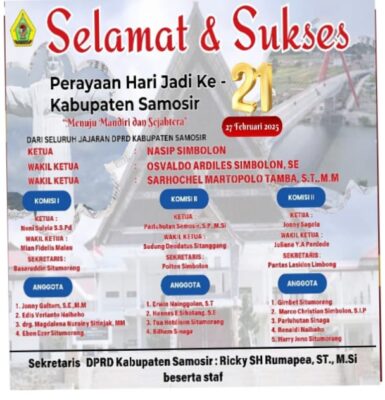 Pemerintah dan masyarakat Kabupaten Samosir merayakan momen bersejarah dalam rangka perayaan Hari Jadi Kabupaten Samosir yang ke-21, pada tanggal 22 Februari 2025. Perayaan yang digelar dengan penuh khidmat ini menjadi simbol kemajuan dan perkembangan daerah yang terus bertransformasi menjadi lebih baik.
