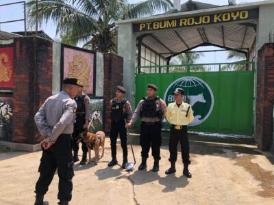 Polresta Banyuwangi melaksanakan sterilisasi dan pengamanan ketat dalam rangka kunjungan kerja Menteri Koordinator Bidang Pangan RI di PT Bumi Rojo Joyo, Kabupaten Banyuwangi, pada Senin (03/02/2025).