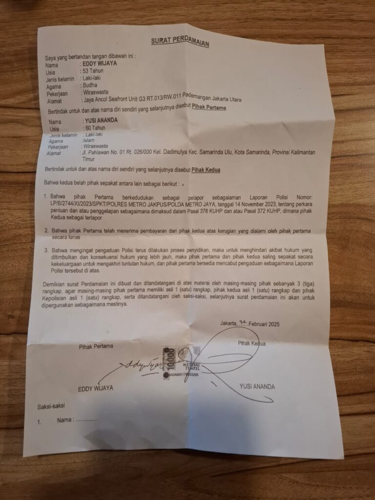 Akibat tekanan pemberitaan yang masif terkait perilaku Polrestro Jakarta Pusat atas kasus dugaan pemerasan itu, akhirnya terjadi kesepakatan damai antara pelapor dan terlapor. Kesepakatan damai itu dituangkan dalam surat perdamaian di depan penyidik pada tanggal 22 Februari 2025 kemarin. “Pihak pertama (Edi Wijaya) dan pihak kedua (Yusi Ananda) saling sepakat secara kekeluargaan untuk mengakhiri tuntutan hukum, dan pihak pertama bersedia mencabut pengaduan sebagaimana Laporan Polisi Nomor: LP/B/2744/XI/2023/SPKT/POLRES METRO JAKPUS/POLDA METRO JAYA, tertanggal 14 November 2023.” Demikian salah satu butir kesepakatan damai pelapor dan terlapor.