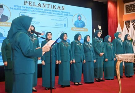 Pengukuhan itu diawali dengan pengukuhan Ketua TP PKK, sekaligus Bunda Paud, Ketua Tim Posyandu dan Ketua Dekrenasda Provinsi Jambi Hj Hesnidar Haris oleh Gubernur Jambi H Al Haris.