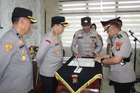 Pekanbaru – Kapolresta Pekanbaru, Kombes Pol Jeki Rahmat Mustika, S.I.K., memimpin upacara serah terima jabatan (Sertijab) Kabag Log dan Kapolsek Bina Widya Polresta Pekanbaru. Kegiatan ini berlangsung pada Senin, 10 Maret 2025, pukul 08.15 WIB di Aula Zapin Polresta Pekanbaru.
