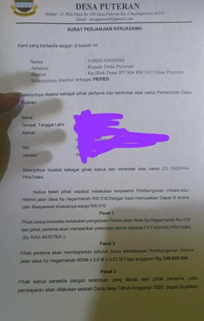 Sebelumnya ramai menjadi perbincangan hangat ditengah masyarakat Desa Puteran, Kecamatan Cikalongwetan, Kabupaten Bandung Barat (KBB) terkait adanya surat perjanjian kerjasama antara Kepala Desa Puteran dengan Cv. Fazhira Pratama.