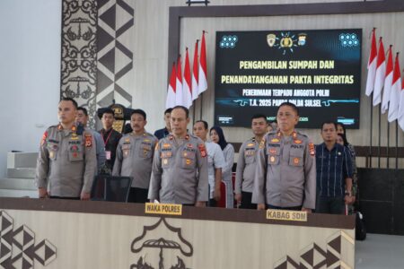 Polres Luwu berkomitmen mewujudkan seleksi penerimaan anggota Polri yang bersih, transparan, akuntabel, dan terpercaya (BETAH). Komitmen ini diwujudkan dalam kegiatan pengambilan sumpah dan penandatanganan pakta integritas rekrutmen terpadu anggota Polri tahun anggaran 2025 yang digelar di Aula Tebbake Tongngenge Polres Luwu, Jumat (7/3/2025).