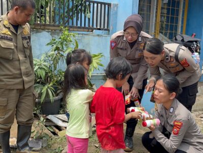 Polwan Polres Bogor Lakukan Pendampingan Trauma Healing terhadap Korban Banjir di Gunung Putri Bogor