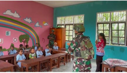 Satgas Yonif 642/Kps melalui Pos Dataran Beimes melaksanakan kegiatan karya bakti di Taman Kanak-Kanak Bouden Ruga, Dataran Beimes, Papua Barat. (18/5).