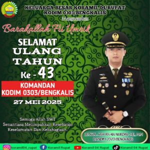 27 Mei 2025 – Komando Rayon Militer (Koramil) 04/Rupat beserta seluruh jajaran hari ini menyampaikan ucapan selamat ulang tahun yang ke-43 kepada Komandan Kodim 0303/Bengkalis.