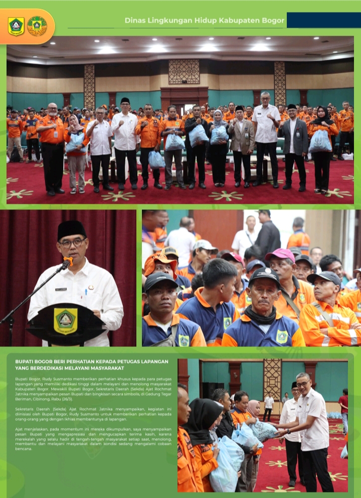 Bupati Bogor, Rudy Susmanto memberikan perhatian khusus kepada para petugas lapangan yang memiliki dedikasi tinggi dalam melayani dan menolong masyarakat Kabupaten Bogor. Mewakili Bupati Bogor, Sekretaris Daerah (Sekda) Ajat Rochmat Jatnika menyampaikan pesan Bupati dan bingkisan secara simbolis, di Gedung Tegar Beriman, Cibinong, Rabu (26/3).