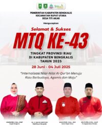 Titi Akar, 26 Juni 2025 – Pemerintah Desa Titi Akar, Kecamatan Rupat Utara, Kabupaten Bengkalis, menyampaikan ucapan Selamat dan Sukses atas pelaksanaan Musabaqah Tilawatil Qur’an (MTQ) ke-43 Tingkat Provinsi Riau Tahun 2025 yang diselenggarakan di Kabupaten Bengkalis.