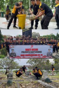 Menyambut Hari Bhayangkara ke-79, jajaran Polresta Banyuwangi melaksanakan kegiatan bakti religi dengan membersihkan lingkungan Taman Makam Pahlawan (TMP) Wisma Raga Satria, Jumat (20/6/2025).