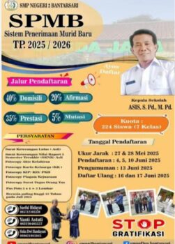 SMP Negeri 2 Bantarsari secara resmi membuka Sistem Penerimaan Murid Baru (SPMB) untuk Tahun Pelajaran 2025/2026 mulai hari ini, Rabu (4/6/2025). Sekolah yang dipimpin oleh Kepala Sekolah, ASIS, S.Pd., M.Pd., ini menyediakan kuota sebanyak 224 siswa dan menegaskan bahwa seluruh proses pendaftaran tidak dipungut biaya alias gratis.
