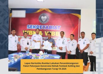 Lembaga Pemasyarakatan (Lapas) Narkotika Kelas IIB Rumbai melaksanakan Penandatanganan Kontrak Paket Pekerjaan Konstruksi Rehab Tembok Keliling dan Pembangunan Turap Tahun Anggaran 2025 dengan pihak penyedia CV. Arya Tama Mandiri pada Rabu (30/7/2025).