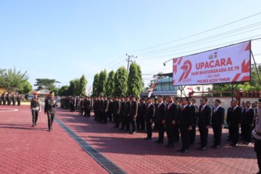Polres Aceh Timur Polda Aceh menggelar upacara peringatan Hari Bhayangkara ke-79 dengan tema “Polri untuk Masyarakat” di Lapangan Sarja Arya Racana, Selasa (01/07/2025) pagi.