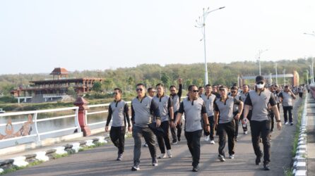 Suasana penuh semangat tampak pagi itu saat Kapolres Nganjuk AKBP Henri Noveri Santoso, S.H., S.I.K., M.M. bersama pejabat utama, para Kapolsek, anggota, dan Bhayangkari menyusuri tanggul Bendungan Semantok di Desa Sambikerep Kecamatan Rejoso sejauh 6 kilometer.