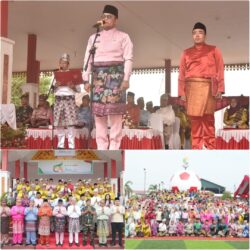 Bupati Pelalawan, H Zukri SM MM bertindak sebagai inspektur upacara pada peringatan Hari Jadi Provinsi Riau ke-68 yang digelar di halaman Taman Bola Pangkalan Kerinci, Sabtu (9/8/2025).