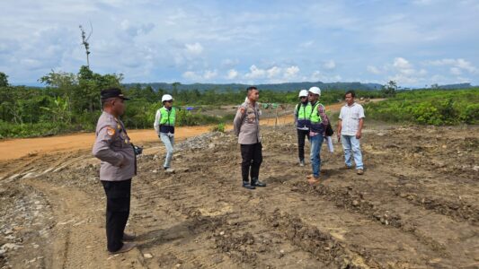 Kapolres Mahakam Ulu AKBP Eko Alamsyah, A.Md., S.H., M.H. bersama Kabag Ren AKP Purwanto, S.H. dan pihak kontraktor meninjau lahan pembangunan Asrama Personel serta Markas Komando (Mako) Polres Mahakam Ulu.