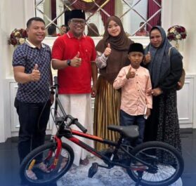 Ekspresi bahagia tampak jelas di wajah sang anak. Senyumnya lebar, matanya berbinar. Ia menerima sepeda itu dengan rasa syukur, seolah mimpi kecilnya tiba-tiba menjadi nyata.