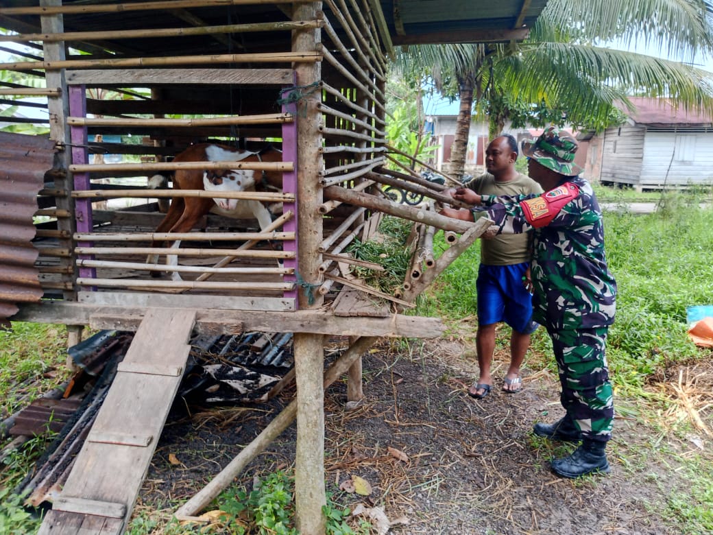 Babinsa Koramil 04/Rupat, Srd Wondo Susilo bersama Bapak Nandar selaku pemilik ternak, melaksanakan kegiatan pemantauan penyakit mulut dan kuku (PMK) pada hewan ternak di Desa Pancur Jaya, Kecamatan Rupat, Kabupaten Bengkalis.
