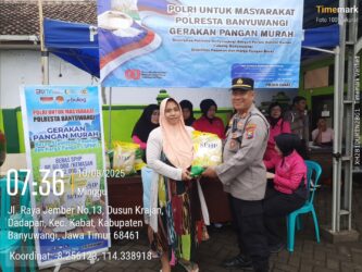 10 Agustus 2025. Polsek Kabat Polresta Banyuwangi bersama Perum Bulog Banyuwangi menggelar Gerakan Pangan Murah di halaman Masjid Baiturrahman, Desa Dadapan, Kecamatan Kabat, Minggu (10/8/2025). Kegiatan ini menghadirkan bazar beras murah yang mendapat sambutan hangat dari warga.