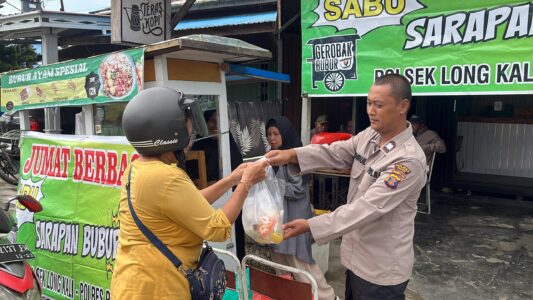 Polsek Long Kali kembali menggelar kegiatan Jumat Berbagi berupa sarapan bubur gratis bersama masyarakat di Teras Kopi, RT 002, Kelurahan/Kecamatan Long Kali, pada Jumat (22/8/2025) pagi. Kegiatan yang dimulai pukul 08.30 WITA ini telah memasuki minggu ke-26 pelaksanaan.