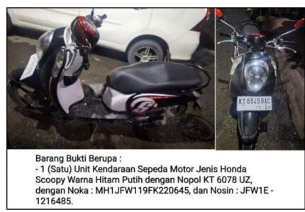 Barang bukti yang disita polisi antara lain satu unit Honda Scoopy hitam putih, STNK, kunci kontak, jaket hitam, sandal gunung, serta pelat nomor palsu.